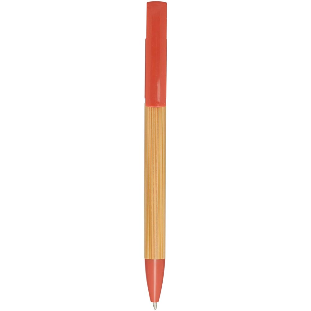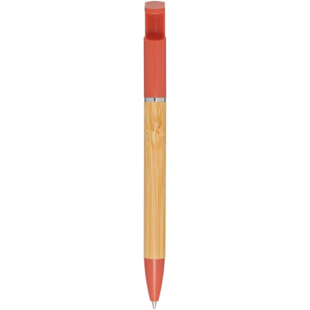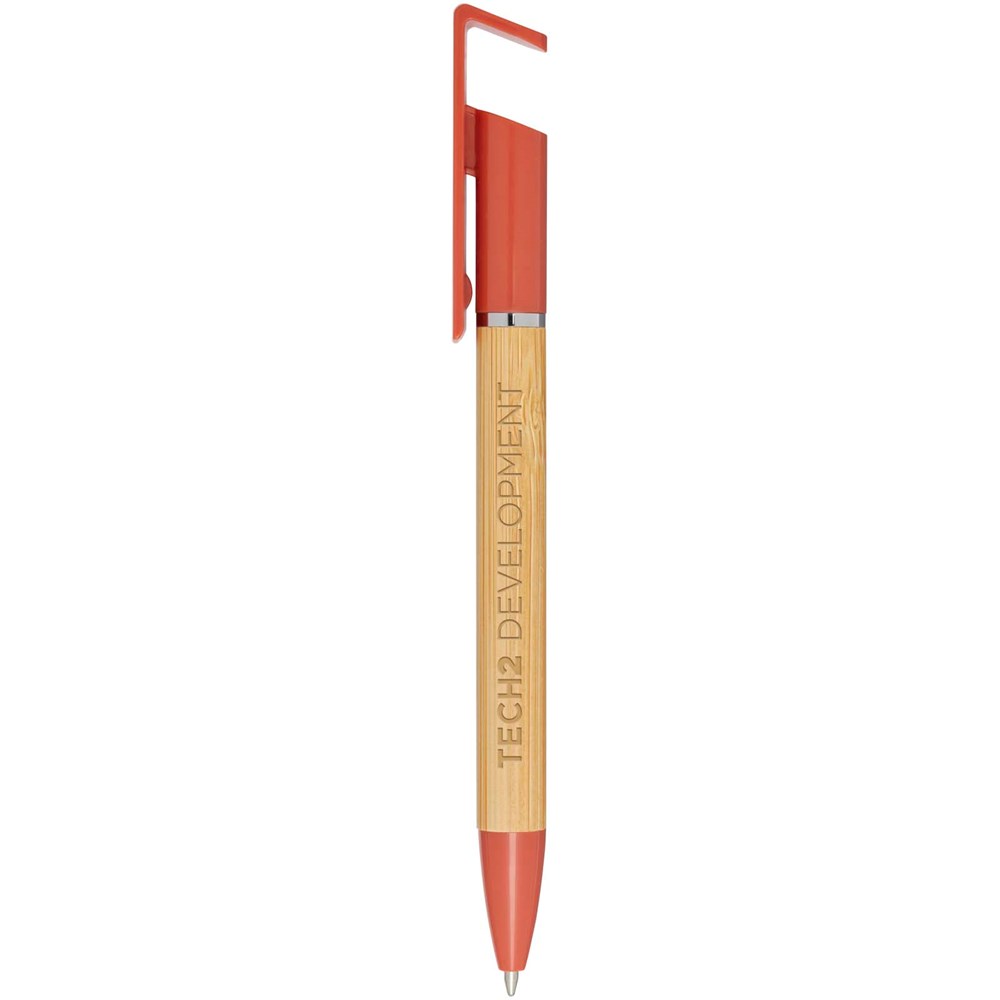 Bamboo-Kugelschreiber, der auch als Telefonhalterung fungiert. Der Knopf und der Mittelring bestehen aus recyceltem Kunststoff, die Spitze aus Messing und der Schaft aus nachhaltig angebautem Bambus. Tintenfarbe: Blau. Schreiblänge: 1000 Meter. Strichstärke: 1,0 mm.