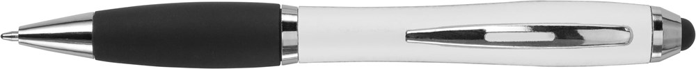 Kugelschreiber aus Kunststoff, mit Drehfunktion, Metall-Clip, gummierter Griffzone, Touchpen und schwarzer Mine.