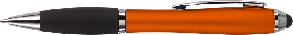 Kugelschreiber aus Kunststoff, mit Drehfunktion, Metall-Clip, gummierter Griffzone, Touchpen und schwarzer Mine.