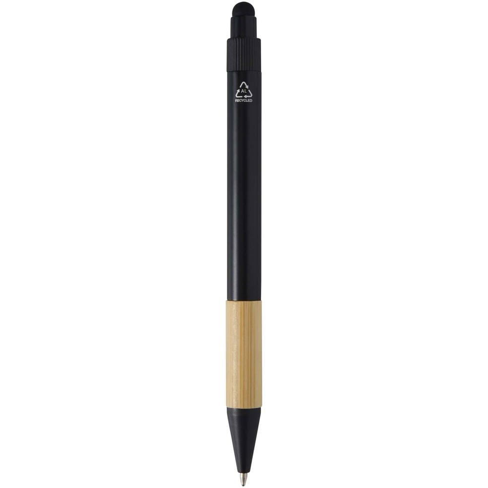 Das Minka Set enthält einen Kugelschreiber aus RCS-zertifiziertem Recycling-Aluminium mit elegantem Bambusgriff und Touchpen-Spitze, einen Aluminium-Schlüsselanhänger (5,5 × 1,8 × 1 cm) mit Bambusdetails und integrierter Telefonhalterung, sowie einen RFID-Kartenhalter (9,7 × 6,2 × 1 cm) mit Gehäuse aus Aluminiumlegierung und Bambusdetails, der bis zu 10 Karten schützt. Der Kugelschreiber ist mit schwarzer Mine ausgestattet und hat eine Schreiblänge von 1000 Metern. Ein durchdachtes, praktisches Produkt, das Funktionalität mit modernem Design verbindet. Geliefert in einer hochwertigen schwarzen Geschenkbox (16 × 16 × 2,7 cm) mit glatter Vorderseite – ideal für die Veredelung mit einem Logo.