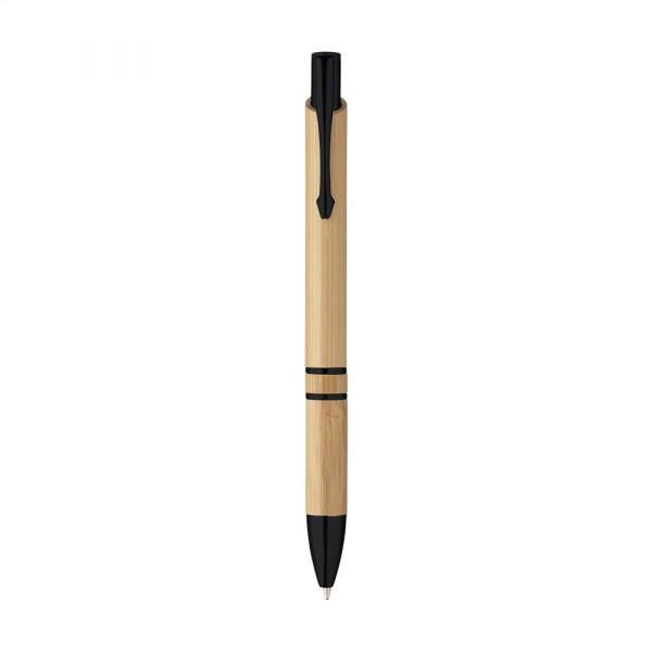 Blau- oder schwarzschreibender Kugelschreiber mit schickem Bambusgehäuse, Chromringen und Metallclip/-druckknopf.