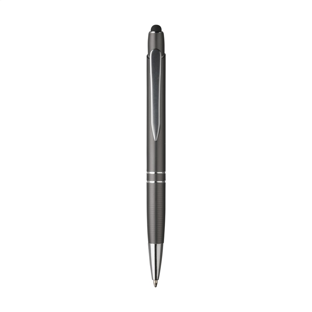 Blauschreibender Aluminium-Kugelschreiber mit griffestem Vorderteil, silbernen Akzenten und metallenem Clip. Mit gummierte Spitze zum Bedienen von Touchscreens (wie iPhone/iPad).