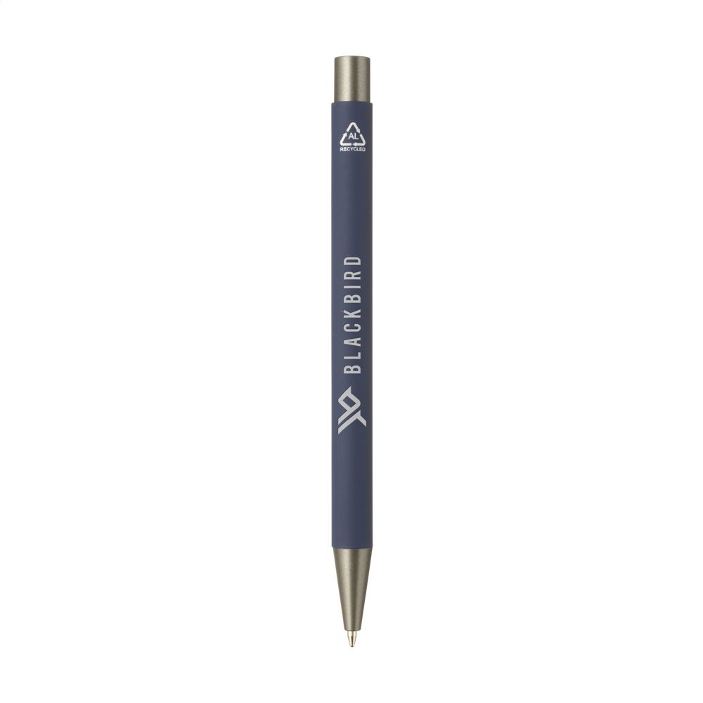 Blauschreibender Kugelschreiber mit einem Gehäuse aus 100 % GRS-zertifiziertem recyceltem Aluminium. Das Gehäuse ist mit einer gummierten Soft-Touch-Oberfläche versehen. Das schlichte Design ohne Clip verleiht dem Stift ein modernes, elegantes Aussehen. RCS-zertifiziert. Gesamtes recyceltes Material: 81%. Durch die Verwendung von recyceltem Aluminium werden bei der Herstellung dieses Produkts weniger neue Rohstoffe verwendet. Das bedeutet weniger Energieverbrauch und weniger Wasserverbrauch.