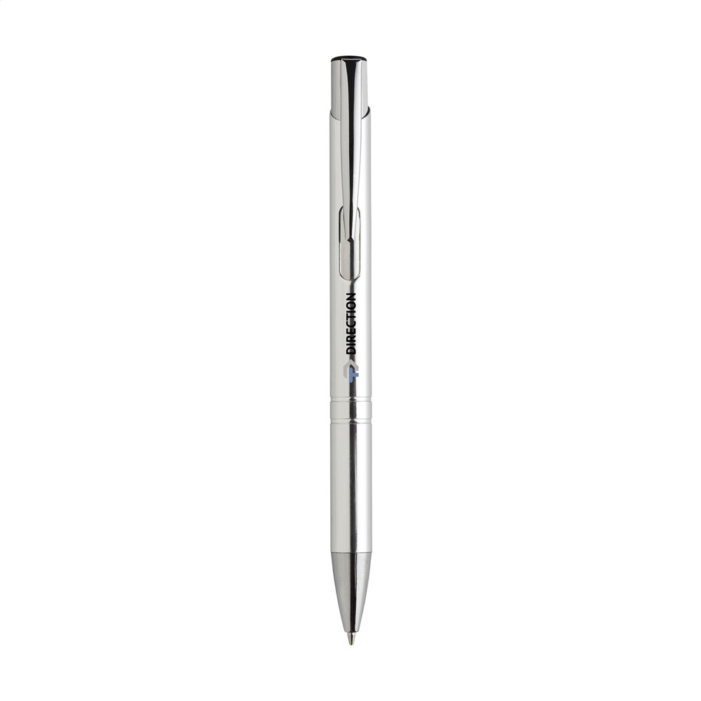 Blauschreibender Aluminiumkugelschreiber mit glänzendem Gehäuse in Metalloptik und metallenem Clip. mehr