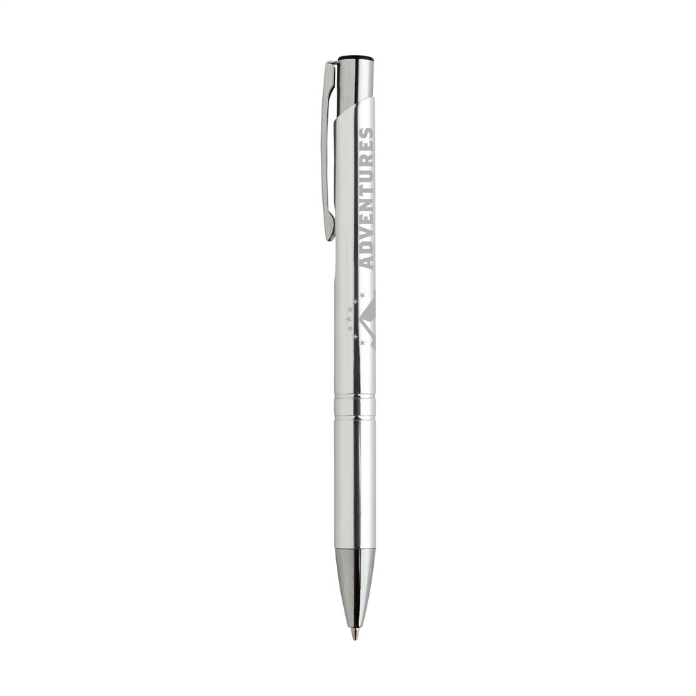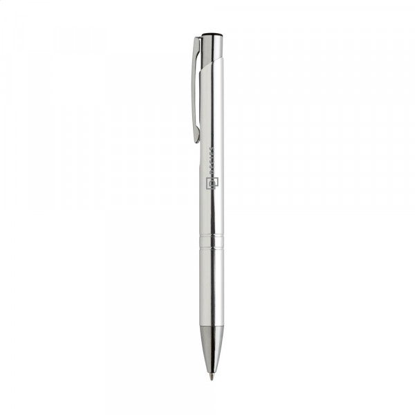 Blauschreibender Aluminiumkugelschreiber mit glänzendem Gehäuse in Metalloptik und metallenem Clip.