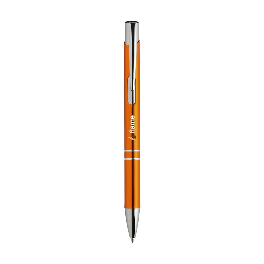Blauschreibender Aluminiumkugelschreiber mit glänzendem Gehäuse in Metalloptik und metallenem Clip.