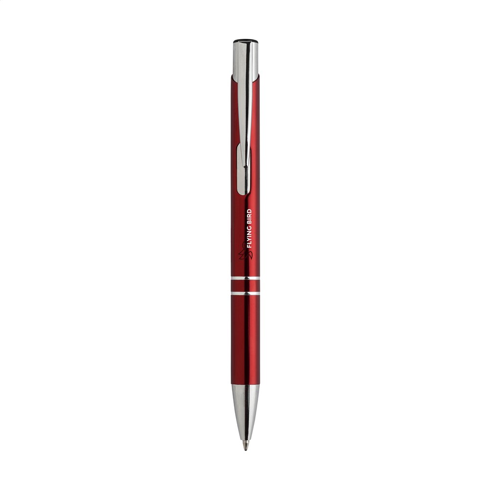 Blauschreibender Aluminiumkugelschreiber mit glänzendem Gehäuse in Metalloptik und metallenem Clip. mehr