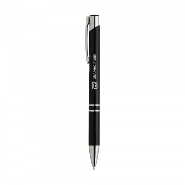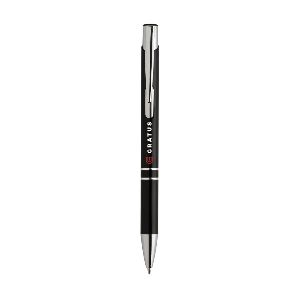 Blauschreibender Aluminiumkugelschreiber mit glänzendem Gehäuse in Metalloptik und metallenem Clip. mehr