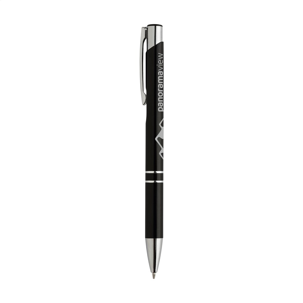 Blauschreibender Aluminiumkugelschreiber mit glänzendem Gehäuse in Metalloptik und metallenem Clip.