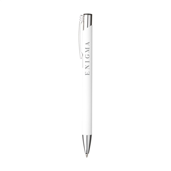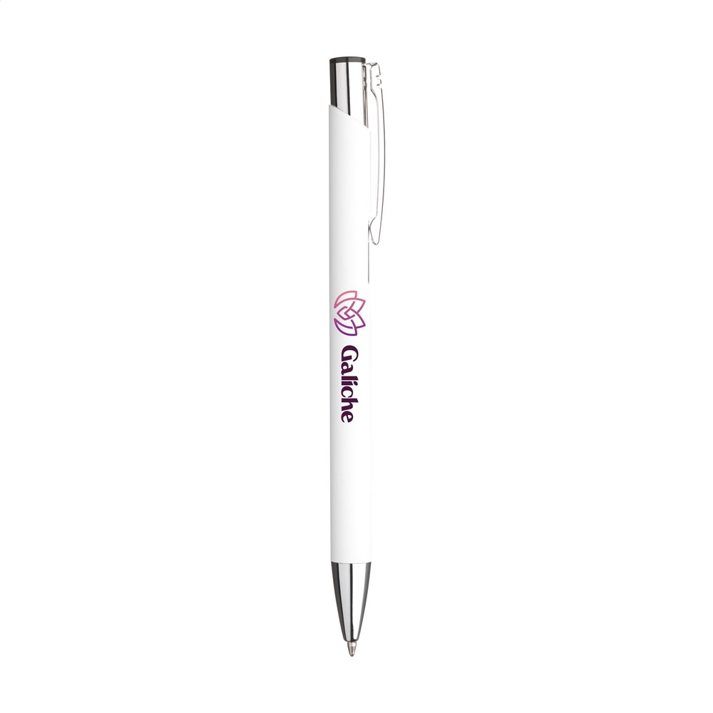 Blauschreibender Aluminium-Kugelschreiber mit Metallclip. Der Halter ist mit einer schönen gummierten Oberfläche versehen. Durch den einteiligen Halter bietet dieser Stift Platz für einen großen Aufdruck.