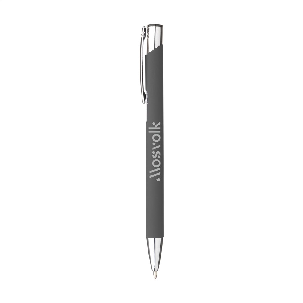 Blauschreibender Aluminium-Kugelschreiber mit Metallclip. Der Halter ist mit einer schönen gummierten Oberfläche versehen. Durch den einteiligen Halter bietet dieser Stift Platz für einen großen Aufdruck.