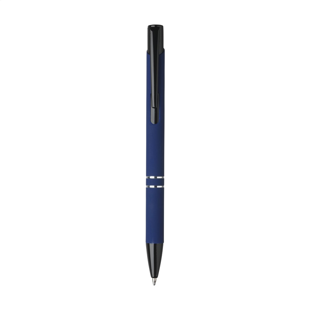 Blauschreibender Kugelschreiber mit schwarzem Druckknopf/Clip und Spitze, Chromverflechtungen. Das Gehäuse ist von einer Gummierung abgeschlossen.