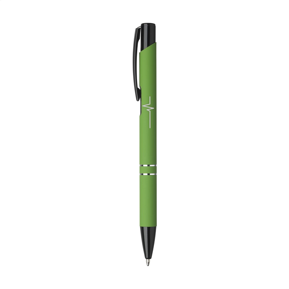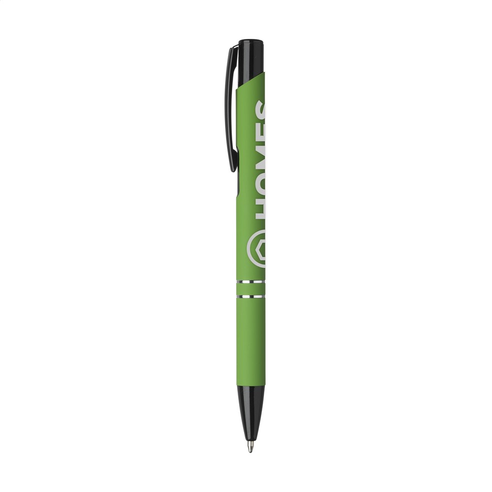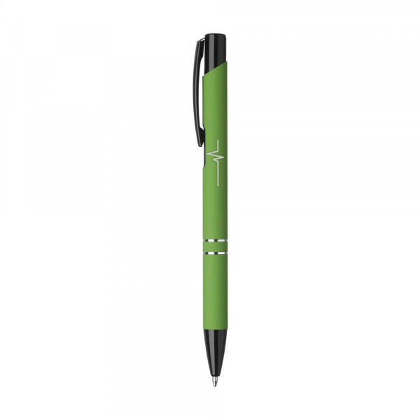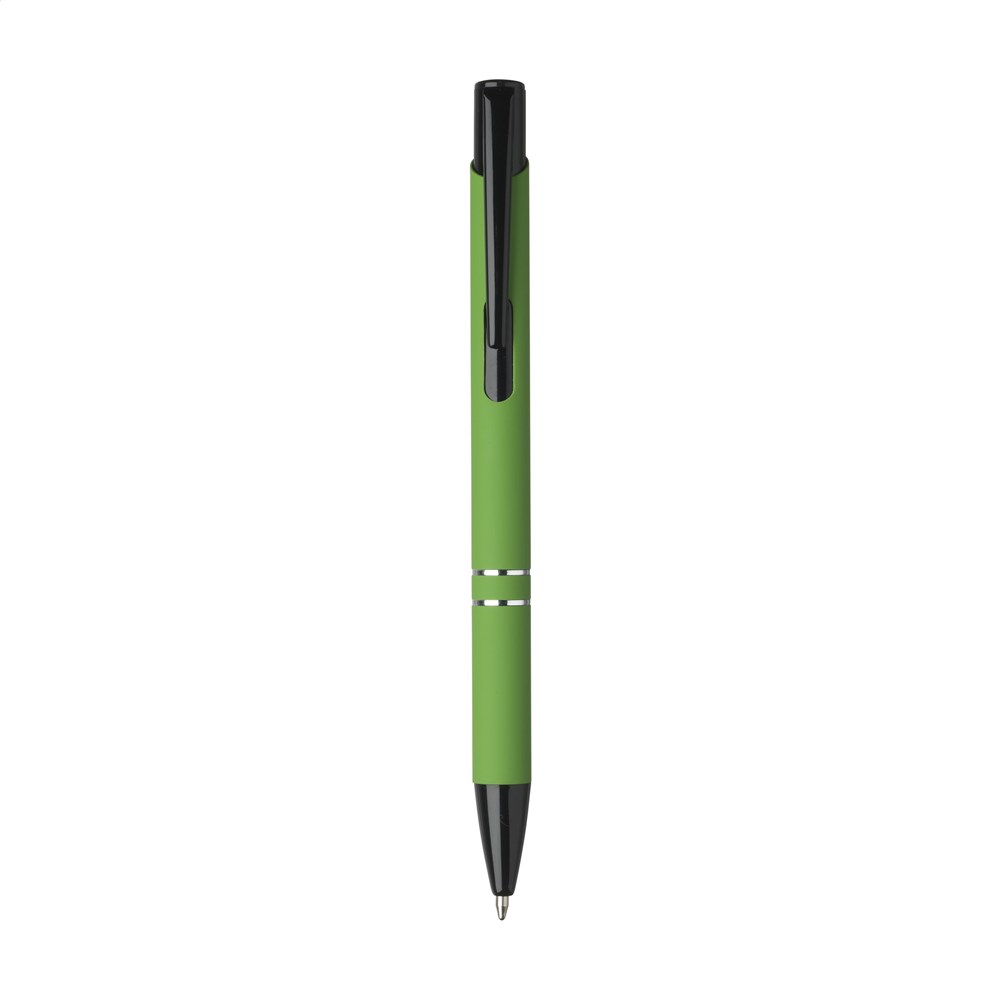 Blauschreibender Kugelschreiber mit schwarzem Druckknopf/Clip und Spitze, Chromverflechtungen. Das Gehäuse ist von einer Gummierung abgeschlossen.