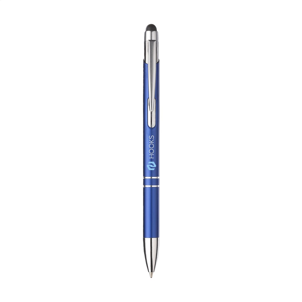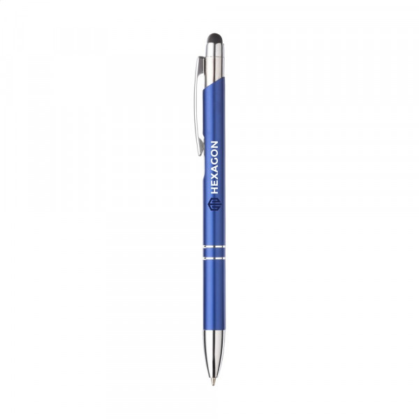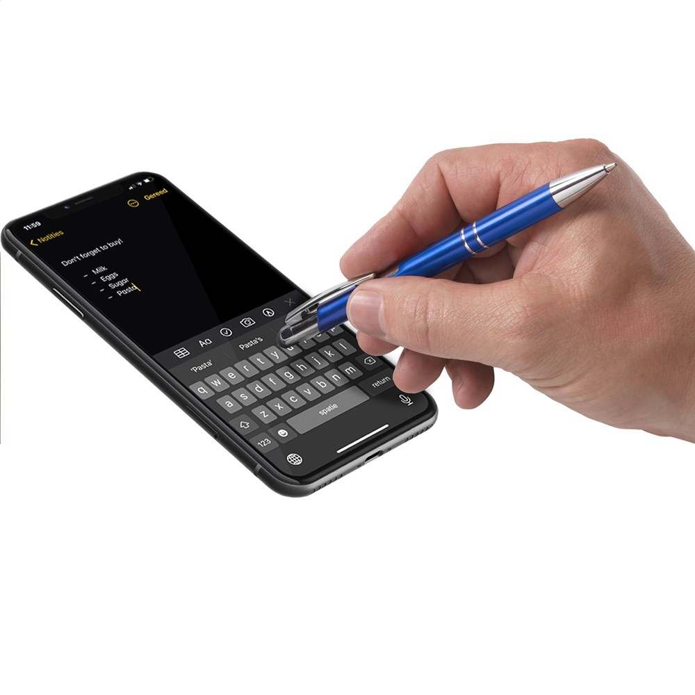 Blauschreibender Kugelschreiber mit Aluminiumgehäuse, gummierte Spitze zum Bedienen von Touchscreens (wie iPhone/iPad), mattfarbenes Metallgehäuse und Metallclip/-druckknopf.