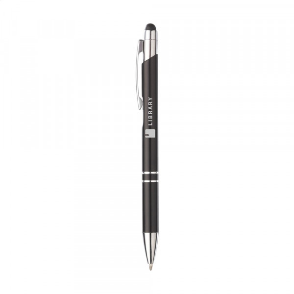 Blauschreibender Kugelschreiber mit Aluminiumgehäuse, gummierte Spitze zum Bedienen von Touchscreens (wie iPhone/iPad), mattfarbenes Metallgehäuse und Metallclip/-druckknopf.