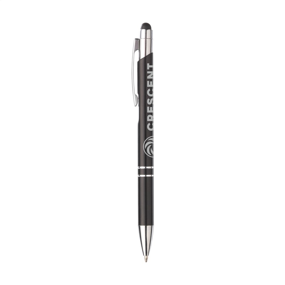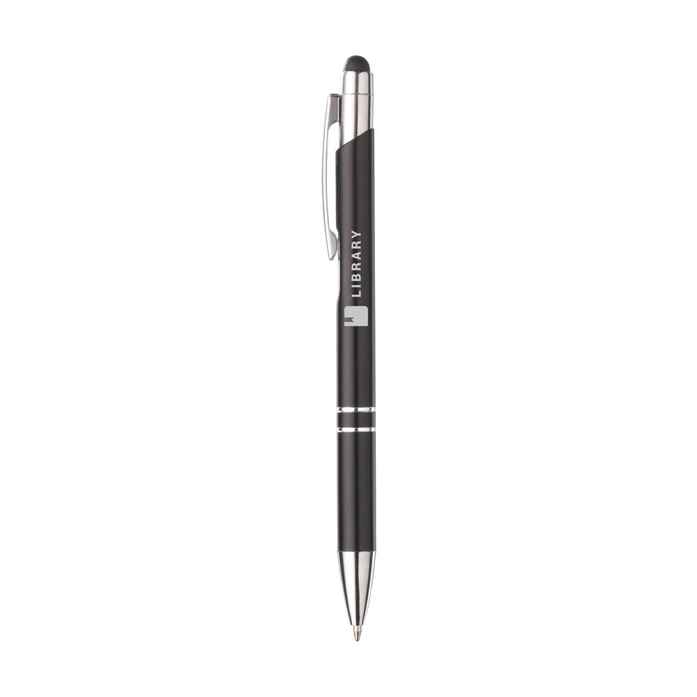 Blauschreibender Kugelschreiber mit Aluminiumgehäuse, gummierte Spitze zum Bedienen von... mehr