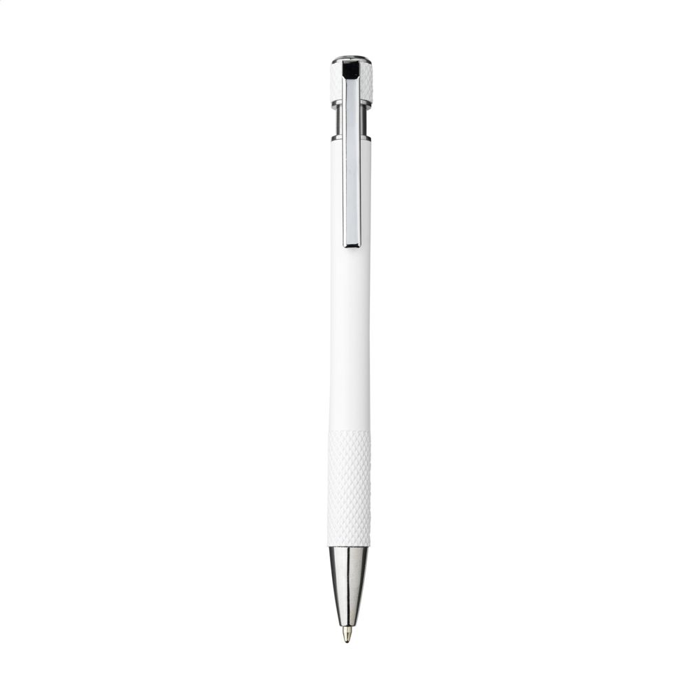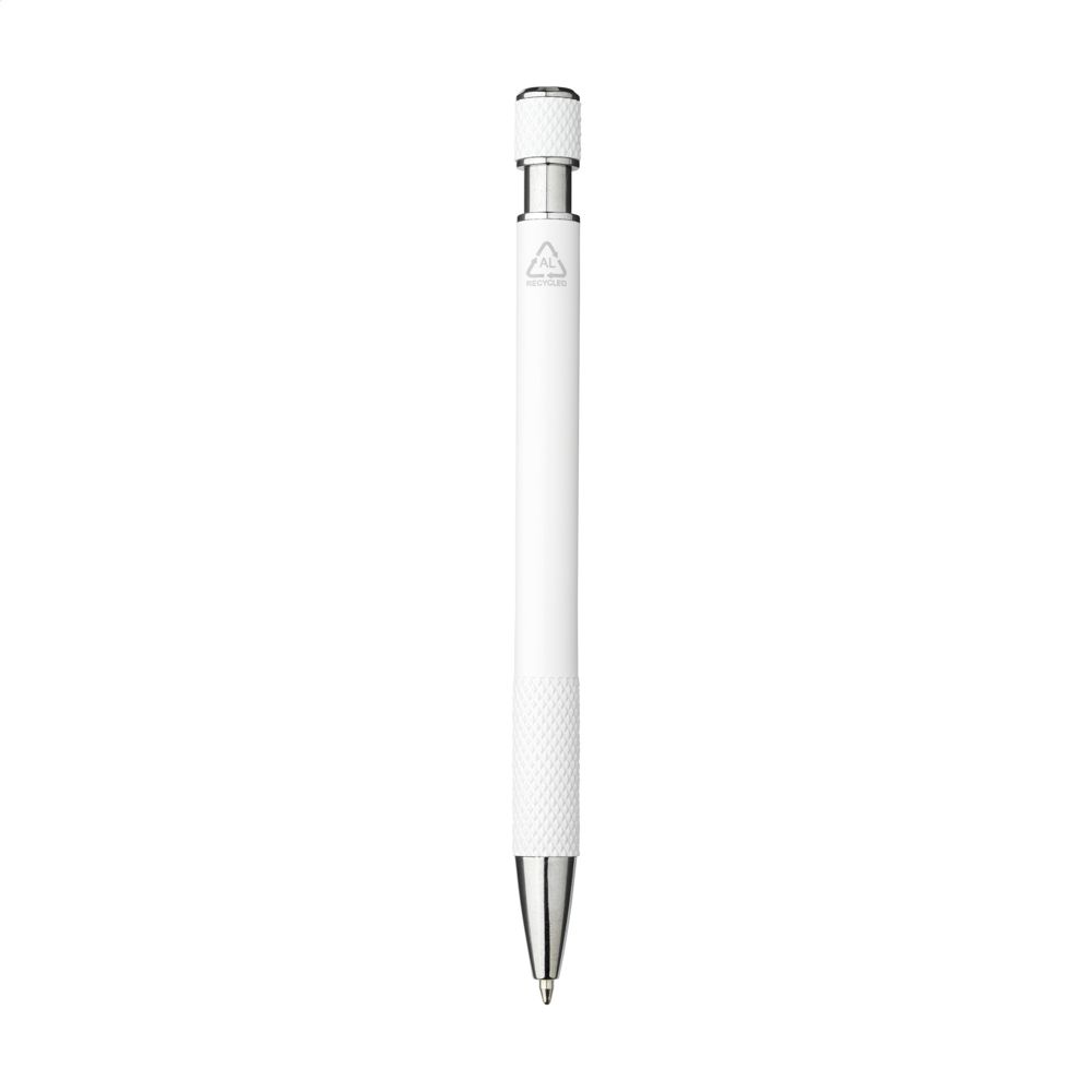 Kugelschreiber mit blauer Tinte und einem Gehäuse aus 100% recyceltem Aluminium. Mit rutschfestem Griff mit dezenten Prägungen, die sich stilvoll auf dem Druckknopf wiederholen. Mit silberfarbenen Hochglanzakzenten und Metallclip. RCS-zertifiziert. Durch die Verwendung von recyceltem Aluminium werden bei der Herstellung dieses Produkts weniger neue Rohstoffe verwendet. Das bedeutet weniger Energieverbrauch und weniger Wasserverbrauch.