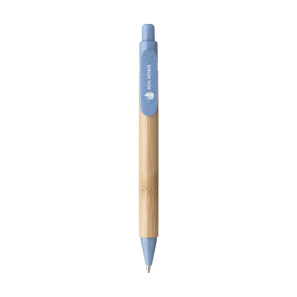 Blauschreibender Kugelschreiber mit Bambusgehäuse. Der Clip, der Druckknopf und die Spitze sind hergestellt aus Weizenstroh/PP-Kunststoff.