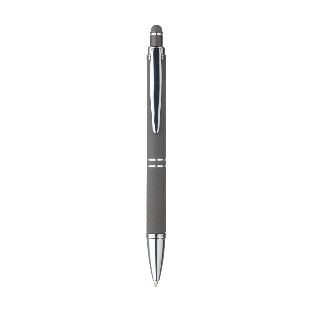 Blauschreibender Aluminium-Kugelschreiber mit Metallclip und gummierter Spitze für das Bedienen von Touchscreens (wie iPhone/iPad). Der Halter ist mit einer schönen gummierte Soft-Touch-Oberfläche versehen. Auf dem Vorderteil ist ein spielerisches Relief angebracht, das für einen festen Griff sorgt. Bei diesem Stift wurde viel Wert auf kleine zusätzliche Details gelegt. Das macht sein Design auffallend attraktiv.