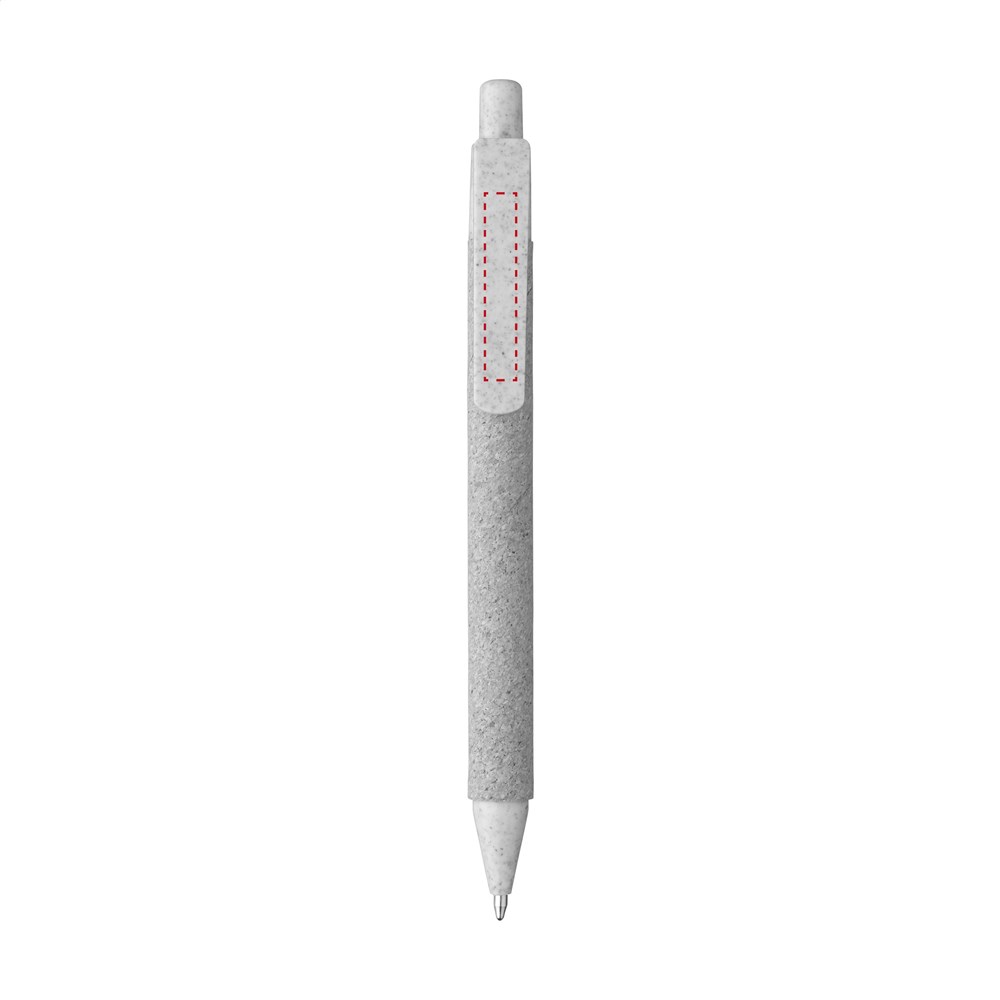 Blauschreibender Kugelschreiber mit Korkgehäuse. Die Spitze, die Oberseite, der Druckknopf und der Clip bestehen aus 50% PP und 50% Weizenstroh. Teilweise biologisch abbaubar.