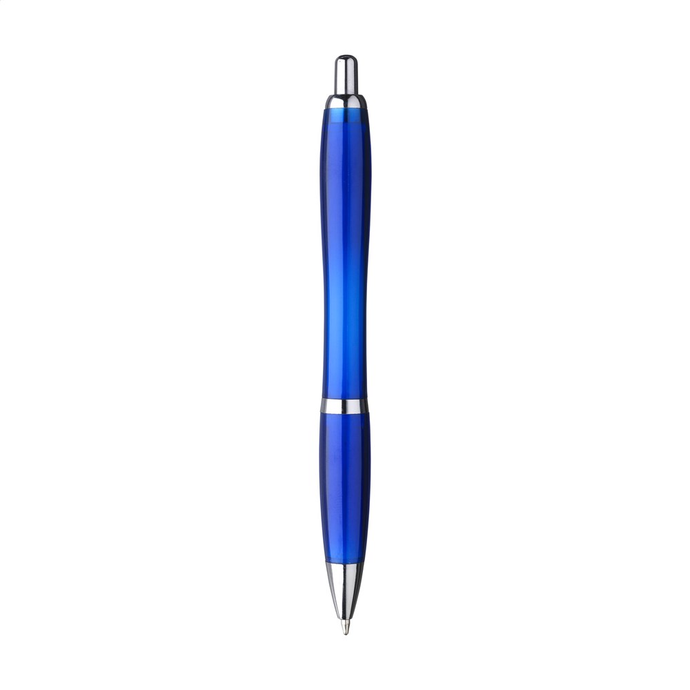 Blauschreibender Kugelschreiber mit transparentem Gehäuse hergestellt aus 100% recyceltem PET. Mit Hochglanzakzenten und Metallclip.