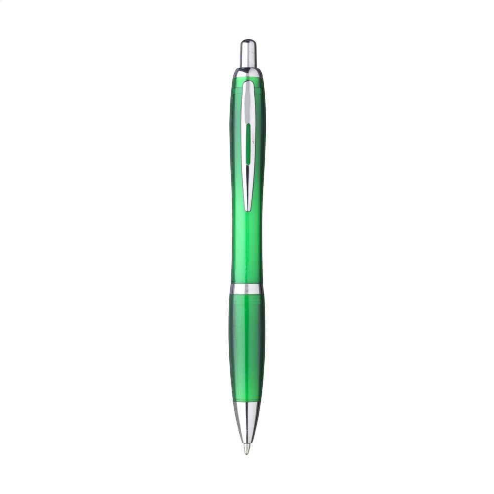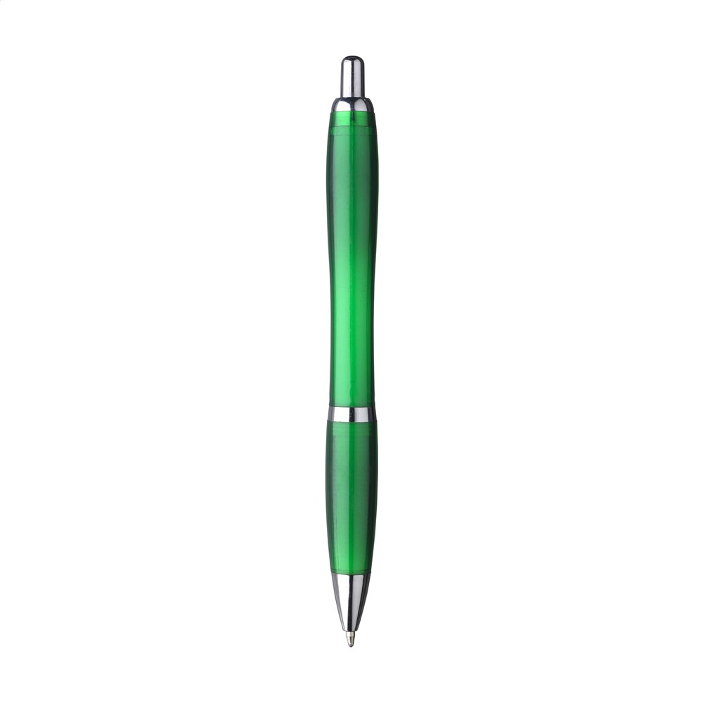 Blauschreibender Kugelschreiber mit transparentem Gehäuse hergestellt aus 100% recyceltem PET. Mit Hochglanzakzenten und Metallclip.
