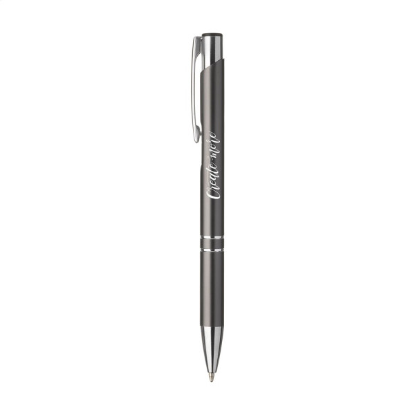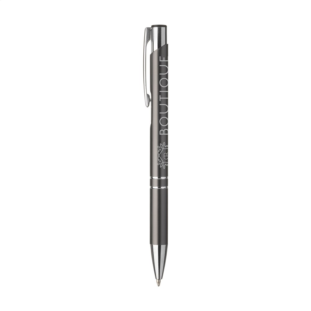 Blauschreibender oder schwarzschreibender Kugelschreiber aus Aluminium mit mattfarbenem Gehäuse in Metalloptik und metallenem Clip/Druckknopf.