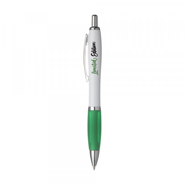 Blauschreibender oder schwarzschreibender Kugelschreiber mit weißem Gehäuse, farbigem, grifffestem Vorderstück und Metallclip.