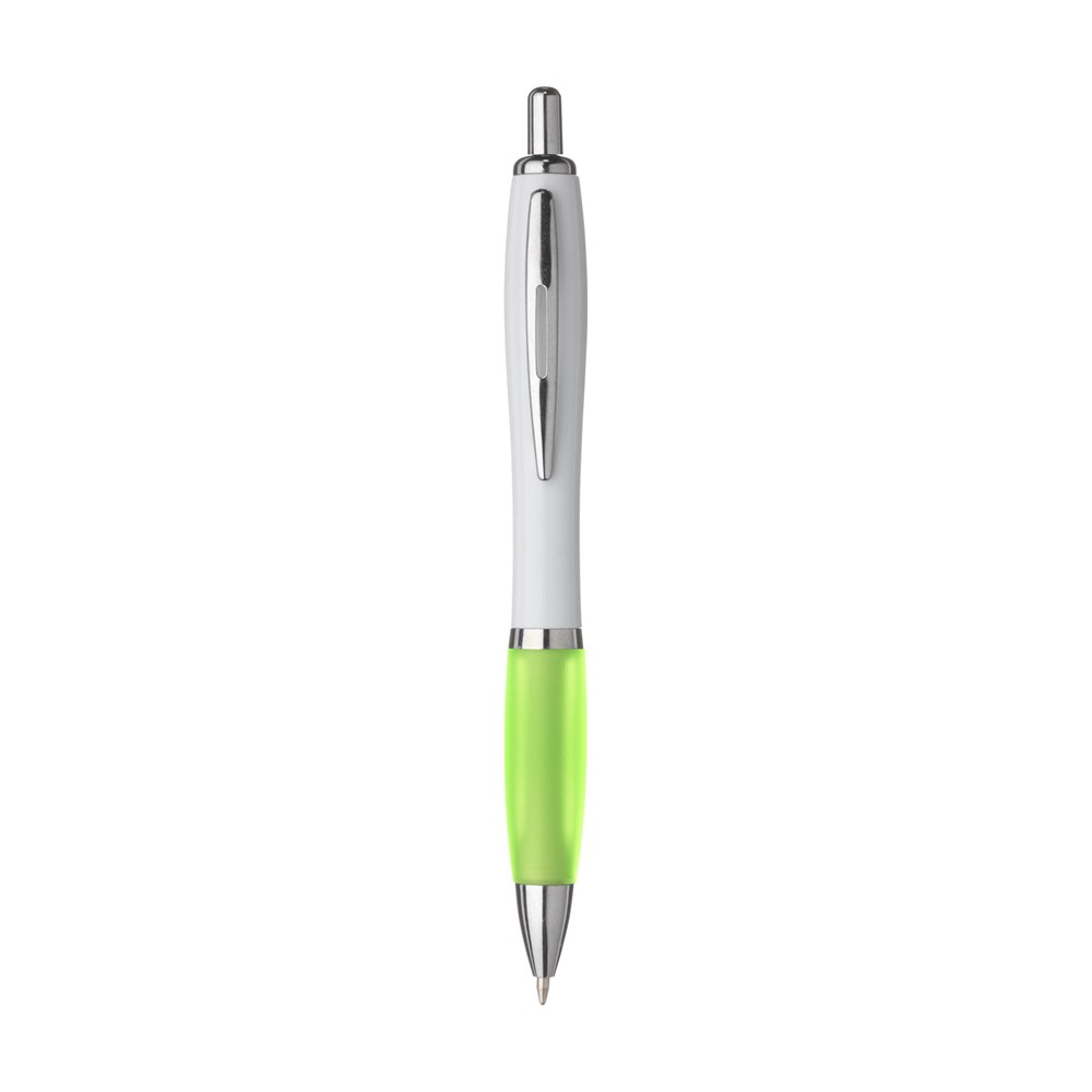 Blauschreibender oder schwarzschreibender Kugelschreiber mit weißem Gehäuse, farbigem, grifffestem Vorderstück und Metallclip.