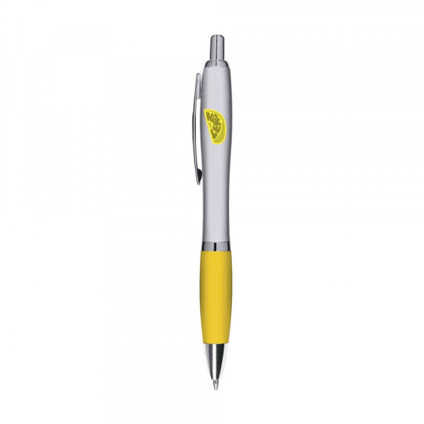 Blauschreibender Kugelschreiber mit farbigem, grifffestem Vorderteil und Metallclip.