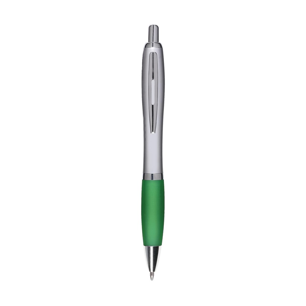 Blauschreibender Kugelschreiber mit farbigem, grifffestem Vorderteil und Metallclip.