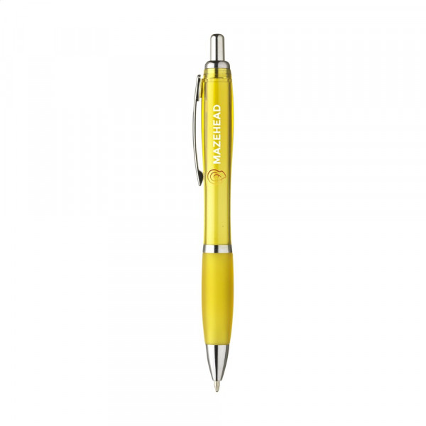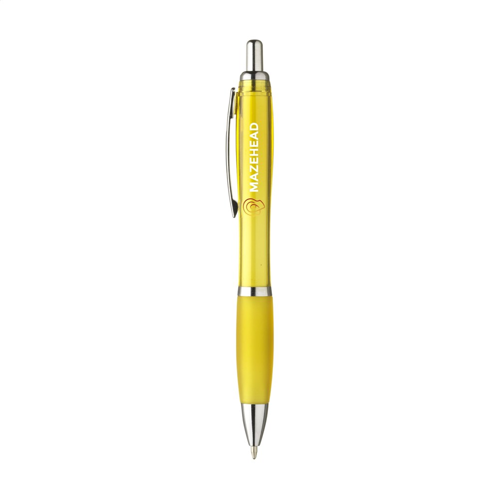 Blauschreibender oder schwarzschreibender Kugelschreiber mit transparentfarbener Gehäuse, grifffestem Vorderteil und Metallclip.
