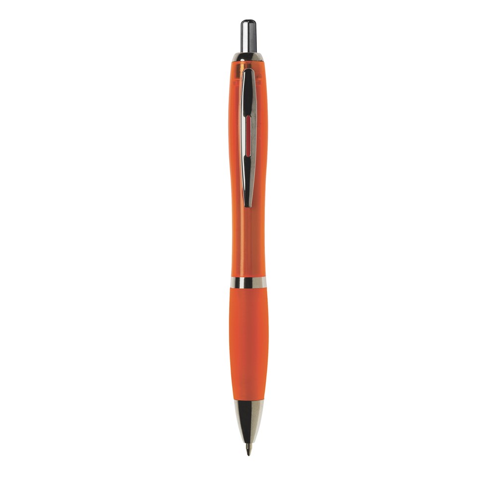 Blauschreibender oder schwarzschreibender Kugelschreiber mit transparentfarbener Gehäuse, grifffestem Vorderteil und Metallclip.