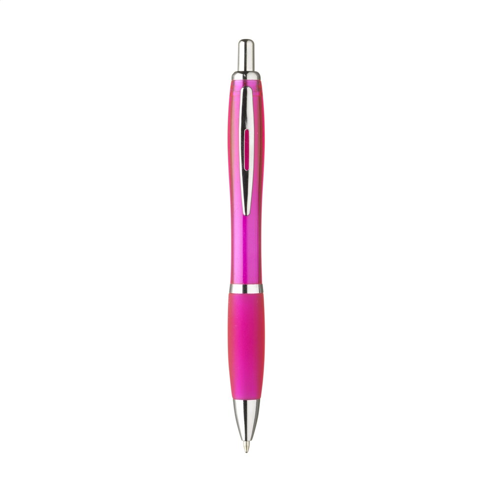 Blauschreibender oder schwarzschreibender Kugelschreiber mit transparentfarbener Gehäuse, grifffestem Vorderteil und Metallclip.