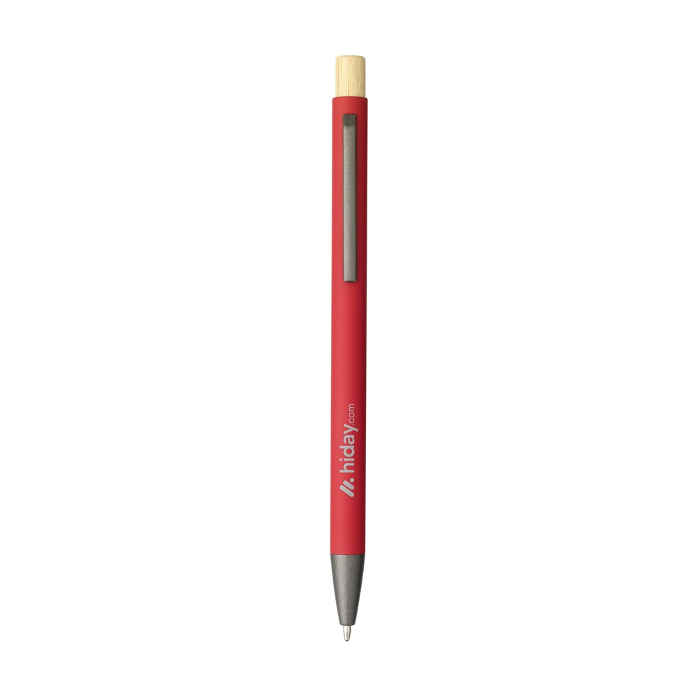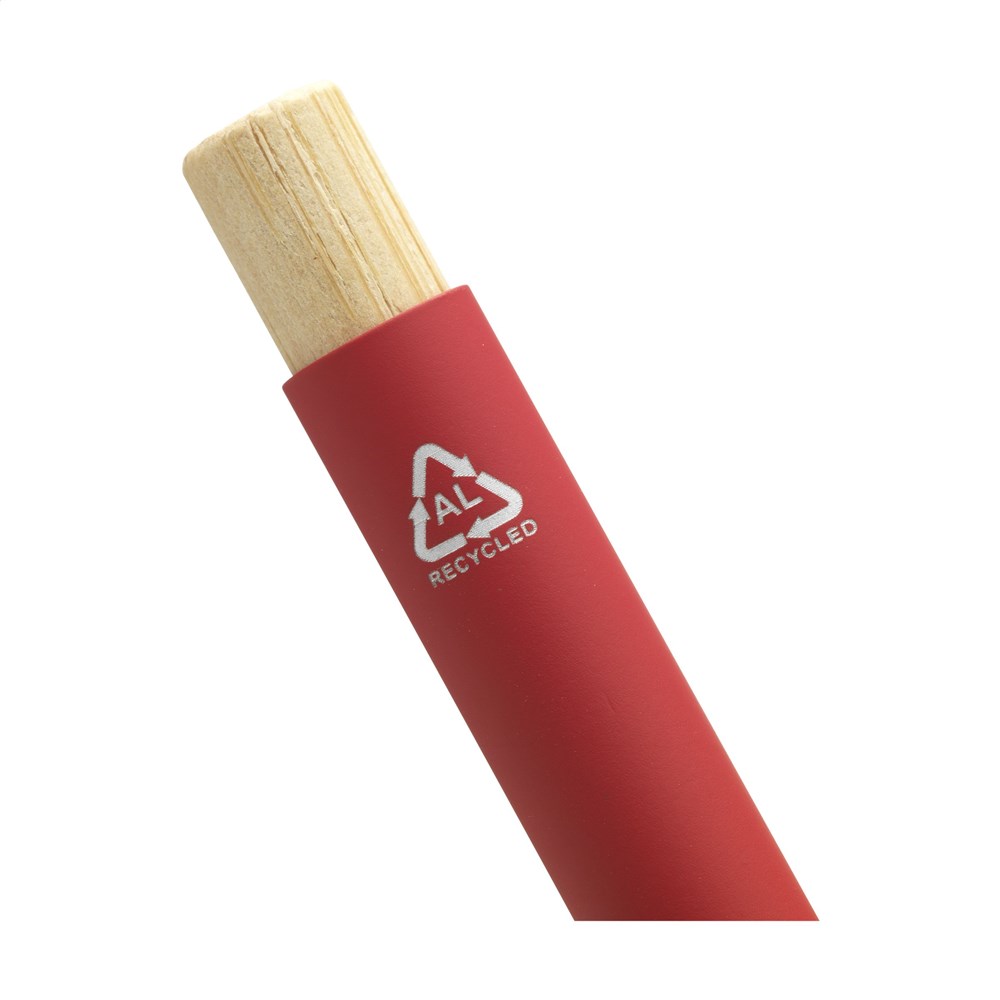 Blauschreibender, schlanker Kugelschreiber mit einem Gehäuse aus 100% recyceltem Aluminium mit gummierter Oberfläche. Metallclip. Schlankes Design. Der Bambus-Druckknopf verleiht dem Stift eine natürlicher Akzent. GRS-zertifiziert. Durch die Verwendung von recyceltem Aluminium kommt eine geringere Menge an neuen Rohstoffen zum Einsatz. Das bedeutet weniger Energieverbrauch und weniger Wasserverbrauch.