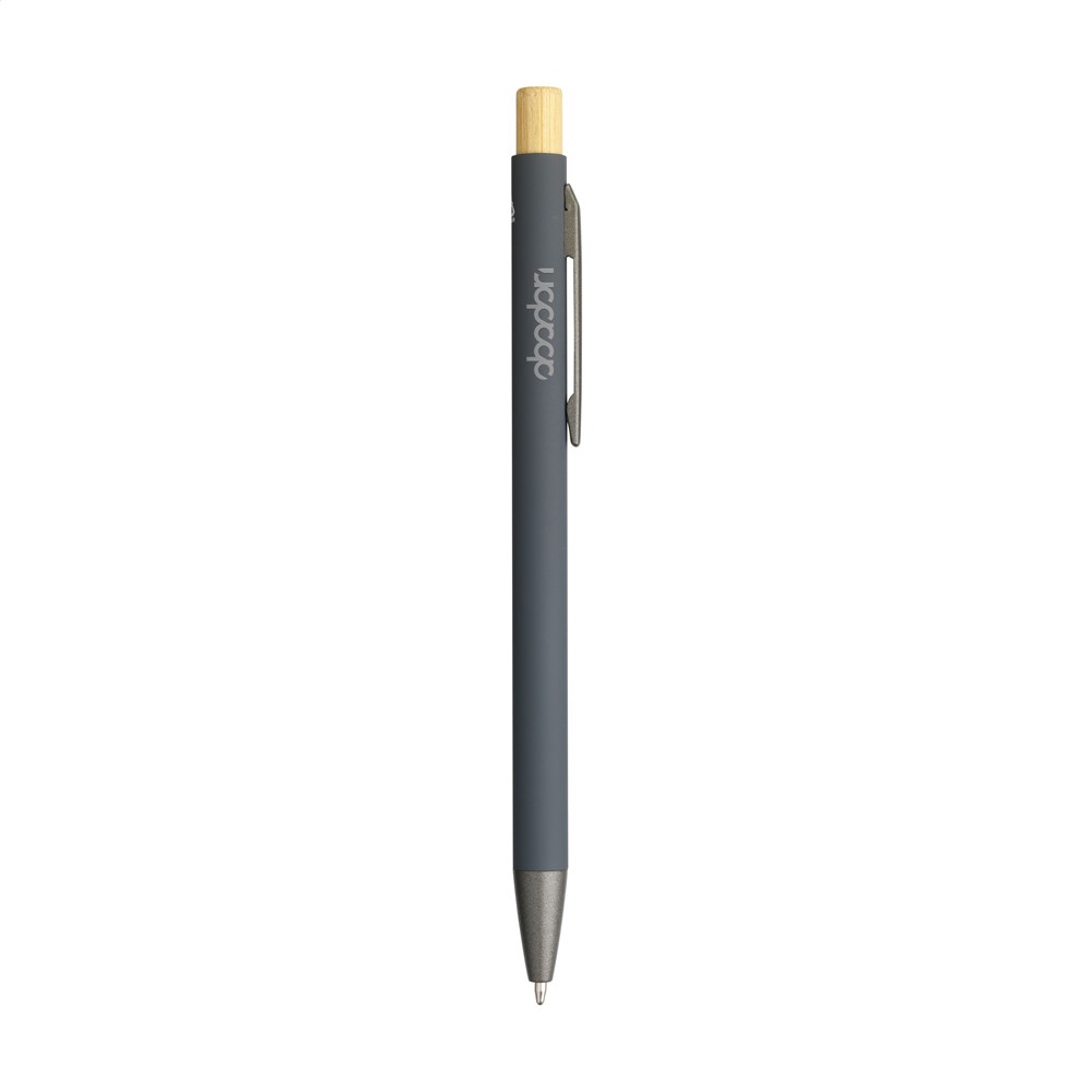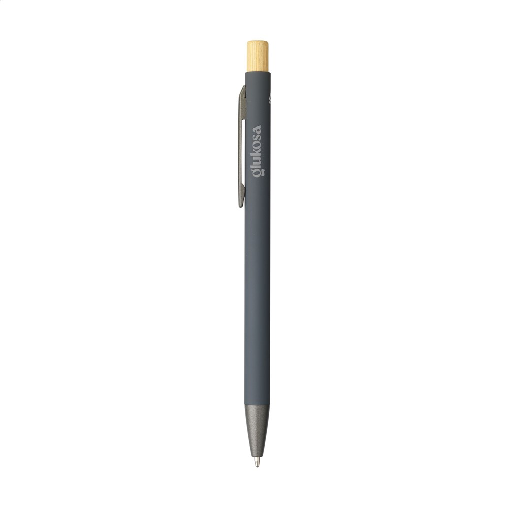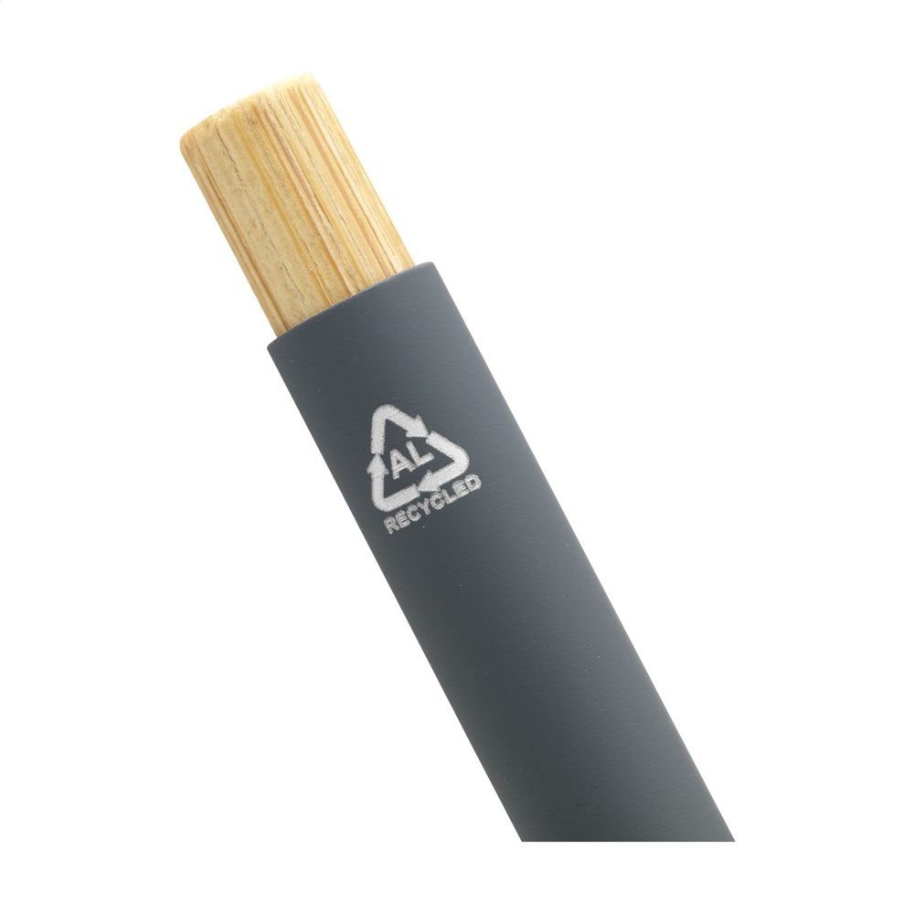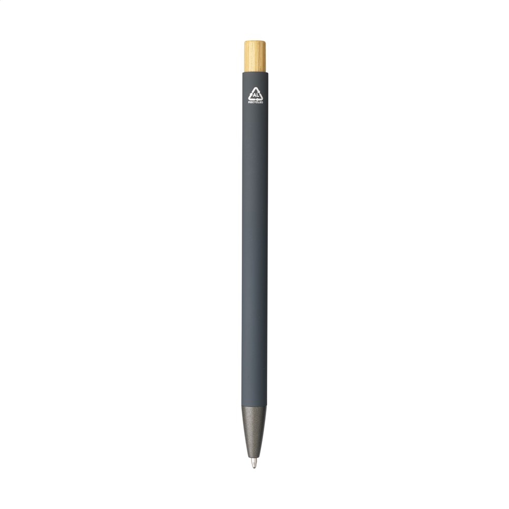 Blauschreibender, schlanker Kugelschreiber mit einem Gehäuse aus 100% recyceltem Aluminium mit gummierter Oberfläche. Metallclip. Schlankes Design. Der Bambus-Druckknopf verleiht dem Stift eine natürlicher Akzent. GRS-zertifiziert. Durch die Verwendung von recyceltem Aluminium kommt eine geringere Menge an neuen Rohstoffen zum Einsatz. Das bedeutet weniger Energieverbrauch und weniger Wasserverbrauch.