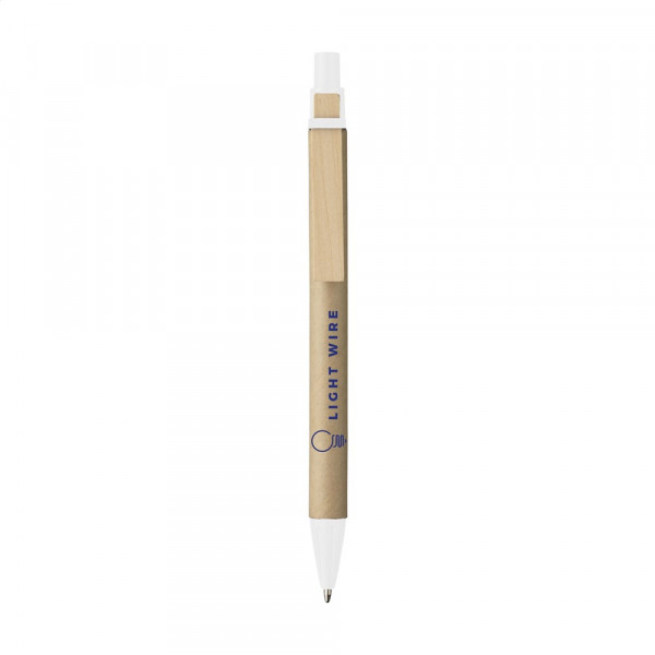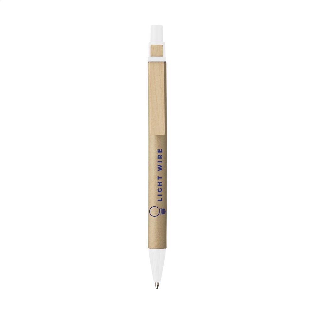 Blauschreibender Kugelschreiber mit FSC Recycled zertifiziert kartongehäus und eingefärbten Kunststoffakzenten.