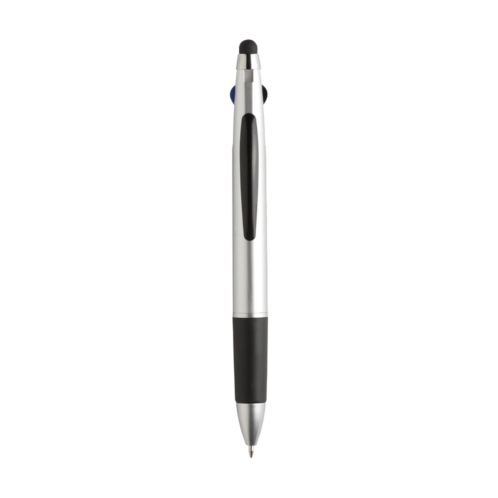 3-farbiger Kugelschreiber mit Gummispitze zum Bedienen von Touchscreens (wie iPhone/iPad), Gehäuse in Metalloptik, silberne Akzente und Gummivorderteil. Mit blauer, roter und schwarzer Tinte.