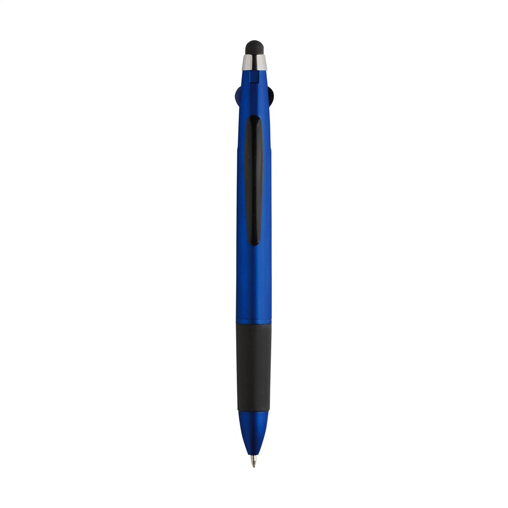 3-farbiger Kugelschreiber mit Gummispitze zum Bedienen von Touchscreens (wie iPhone/iPad), Gehäuse in Metalloptik, silberne Akzente und Gummivorderteil. Mit blauer, roter und schwarzer Tinte.