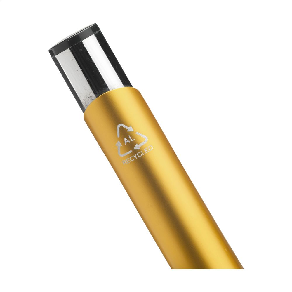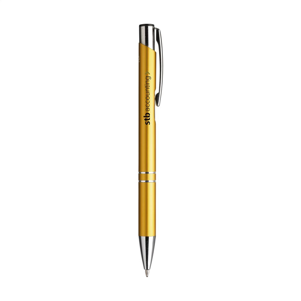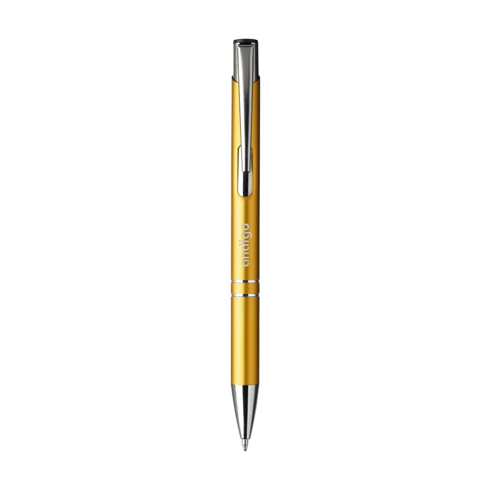 Blauschreibender Kugelschreiber aus recyceltem Aluminium. Der Halter ist mit einer wunderschön glänzenden Oberfläche im Metallic-Look versehen. Mit Metallclip. Durch die Verwendung von recyceltem Aluminium werden bei der Herstellung dieses Produkts weniger neue Rohstoffe verwendet. Das bedeutet weniger Energieverbrauch und weniger Wasserverbrauch.
