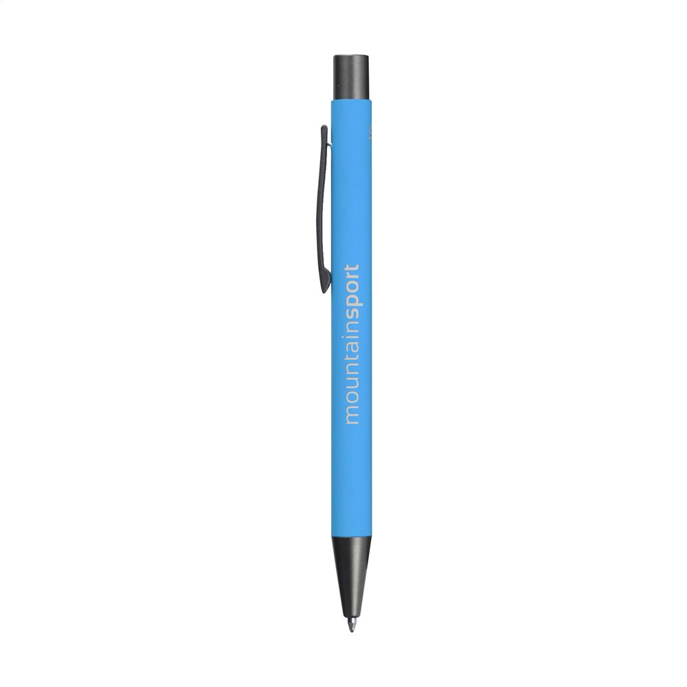 Blauschreibender Kugelschreiber aus recyceltem Aluminium. Das Gehäuse ist mit einer schönen gummierten Oberfläche versehen. Mit robustem Metallclip, Kunststoffspitze und Druckknopf. Durch die Verwendung von recyceltem Aluminium werden bei der Herstellung dieses Produkts weniger neue Rohstoffe verwendet. Das bedeutet weniger Energieverbrauch und weniger Wasserverbrauch.