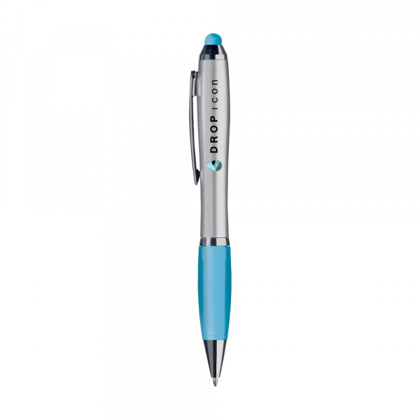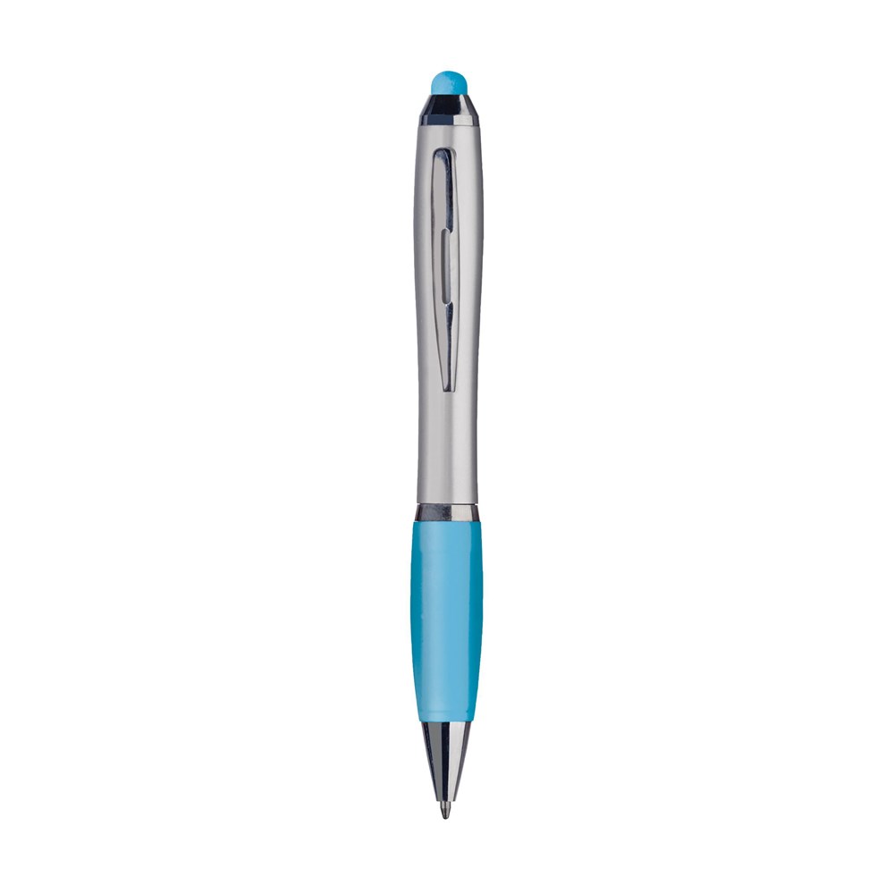 Blauschreibender Kugelschreiber mit farbiger, gummierter Spitze/Pointer zum Bedienen von Touchscreens (wie iPhone/iPad), hochglänzenden Akzenten, farbigem, grifffestem Vorderteil, Aussparungen im Metallclip und Dreh-Klicksystem.