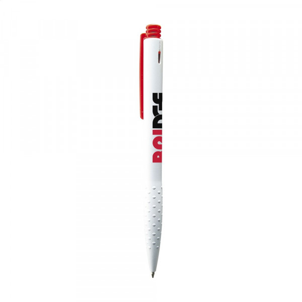 Blauschreibender oder schwarzschreibender Kugelschreiber mit grifffestem Vorderteil, farbigem Clip und Druckknopf.