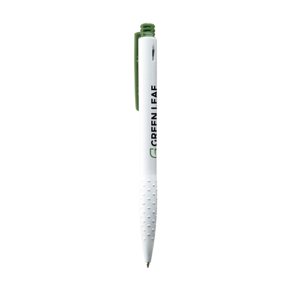 Blauschreibender oder schwarzschreibender Kugelschreiber mit grifffestem Vorderteil, farbigem Clip und Druckknopf.