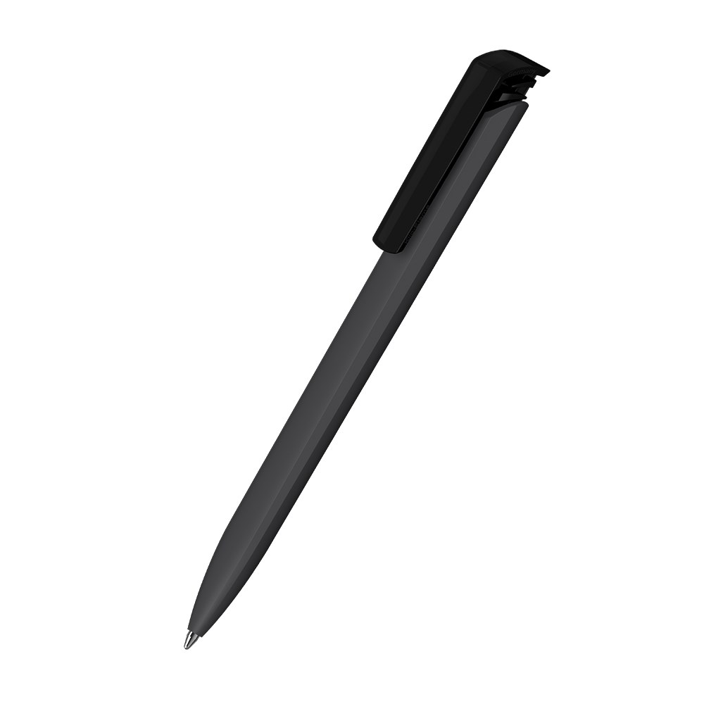 Der Trias softtouch/transparent ist ein Druckkugelschreiber. Materialien und Oberflächen: Schaft: Kunststoff (ABS), gummierte Softtouch-Oberfläche. Drückerklipp: Kunststoff (M-ABS) transparent. Minenröhrchen: Recyceltes Polypropylen (rPP). Standardfarben: Schaft und Drückerklipp: aus 14 Farben kombinierbar. Sonderfarben: ab 5.000 Stück, ab 25.000 Stück ohne PMS-Zuschlag. Standardmine: Silktech L (3.000 m), blau oder schwarz, Mine optional: