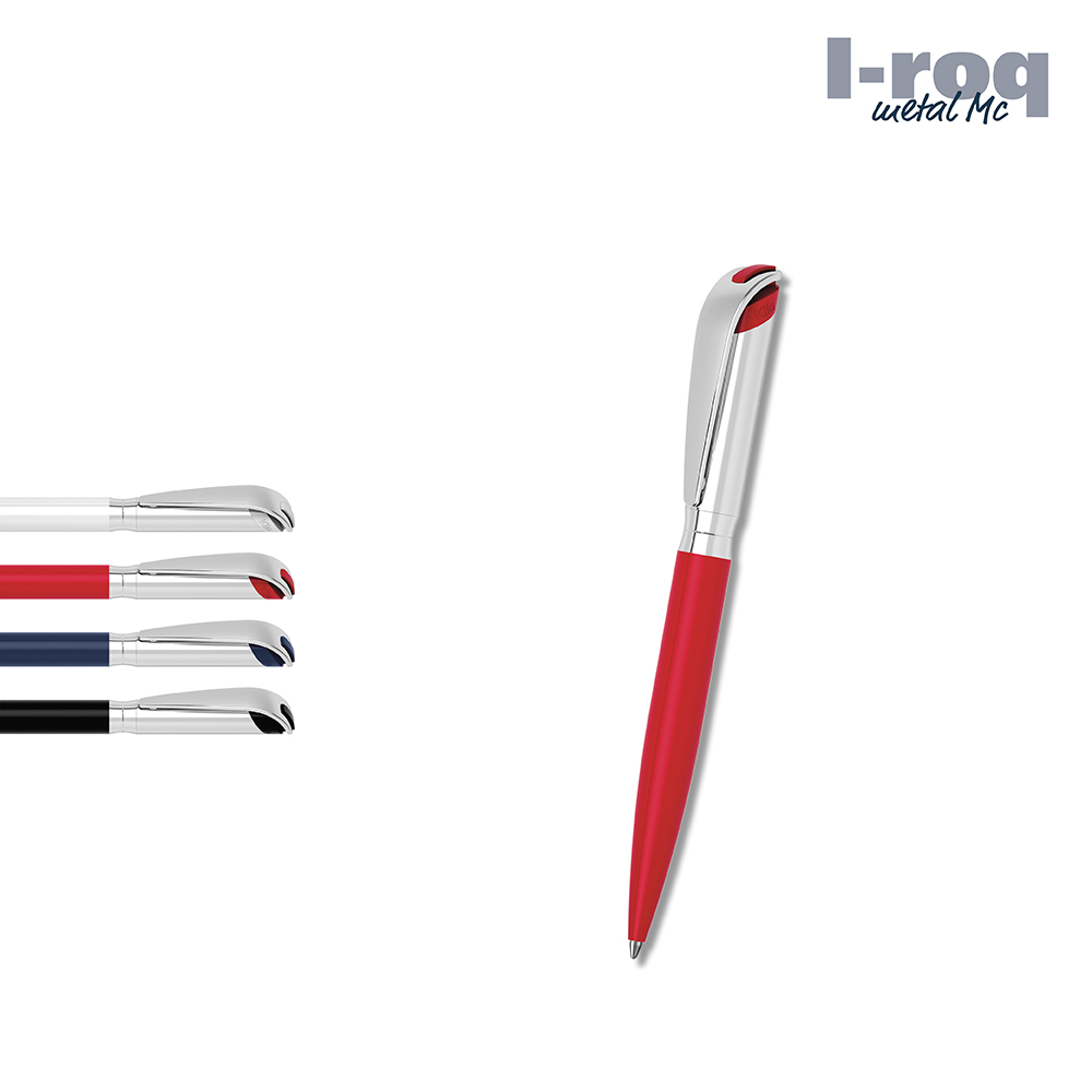 Der I-roq metal Mc ist ein Drehkugelschreiber. Materialien und Oberflächen: Schaft: Messing verchromt, glanzlackiert. Ring und Oberteil: Messing glanzverchromt. Klipp: Federstahl glanzverchromt. Standardfarben: Schaft: in 4 Farben erhältlich. Sonderfarben: ab 10.000 Stück, ab 25.000 Stück ohne PMS-Zuschlag. Standardmine: Multifill P (8.000 m), blau, Mine optional: Multifill P (schwarz).