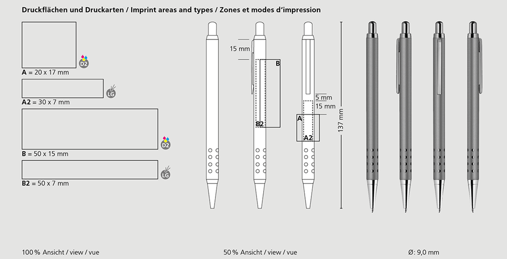 Der Aura metal MMc ist ein Druckkugelschreiber. Materialien und Oberflächen: Spitze: Messing glanzverchromt. Schaft: Aluminium lackiert. Drücker: Messing glanzverchromt. Klipp: Federstahl glanzverchromt. Minenröhrchen: Recyceltes Polypropylen (rPP). Standardfarben: Schaft: in 6 Farben erhältlich. Sonderfarben: ab 10.000 Stück, ab 25.000 Stück ohne PMS-Zuschlag. Standardmine: Silktech L (3.000 m), blau, Mine optional: Silktech L (schwarz), Silktech XL, Multifill P.