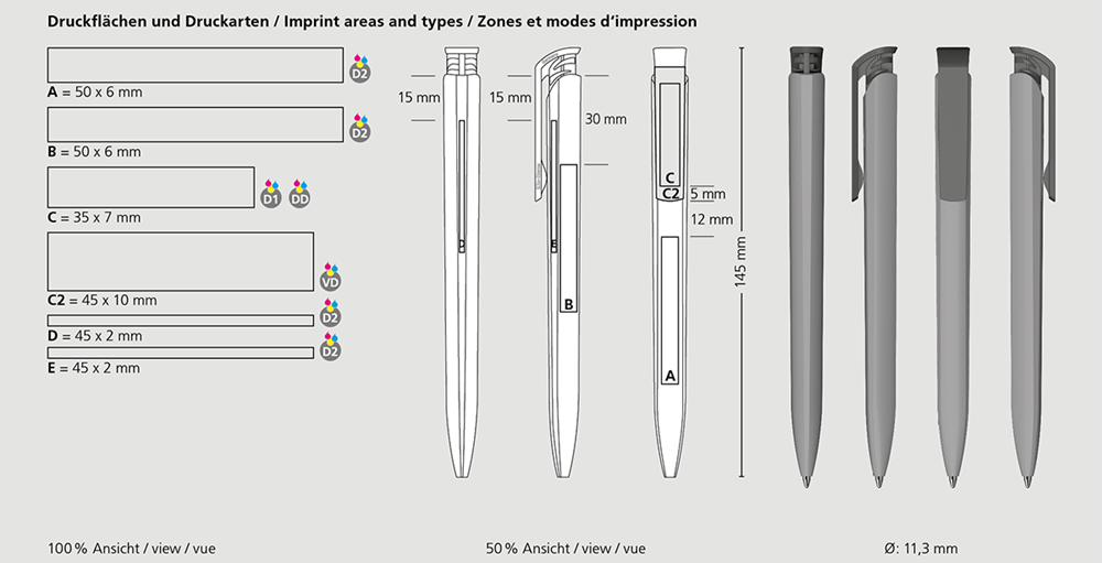 Der Trias softtouch/high gloss ist ein Druckkugelschreiber. Materialien und Oberflächen: Schaft: Kunststoff (ABS), gummierte Softtouch-Oberfläche. Drückerklipp: Kunststoff (ABS) hochglänzend. Minenröhrchen: Recyceltes Polypropylen (rPP). Standardfarben: Schaft und Drückerklipp: aus 14 Farben kombinierbar. Sonderfarben: ab 5.000 Stück, ab 25.000 Stück ohne PMS-Zuschlag. Standardmine: Silktech L (3.000 m), blau oder schwarz, Mine optional:
