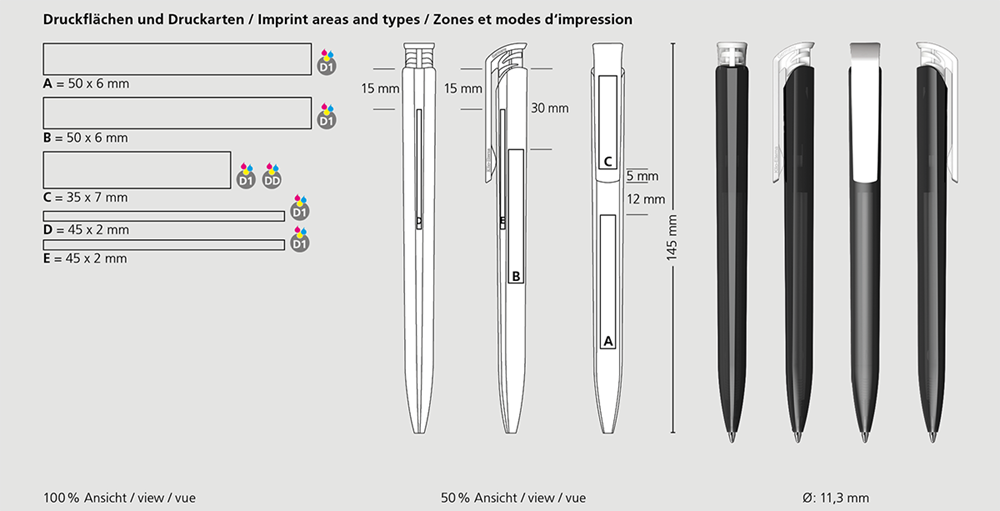 Der Trias transparent/high gloss ist ein Druckkugelschreiber. Materialien und Oberflächen: Schaft: Kunststoff (M-ABS) transparent. Drückerklipp: Kunststoff (ABS) hochglänzend. Minenröhrchen: Recyceltes Polypropylen (rPP). Standardfarben: Schaft: aus 12 Farben kombinierbar. Drückerklipp: aus 14 Farben kombinierbar. Sonderfarben: ab 5.000 Stück, ab 25.000 Stück ohne PMS-Zuschlag. Standardmine: Silktech L (3.000 m), blau oder schwarz, Mine optional:
