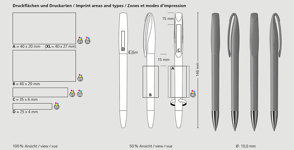 Der Boa high gloss Mn ist ein Drehkugelschreiber. Materialien und Oberflächen: Spitze: Messing vernickelt. Schaft und Oberteil: Kunststoff (ABS) hochglänzend, Oberteil: Mix aus matten und glänzenden Flächen. Minenröhrchen: Recyceltes Polypropylen (rPP). Standardfarben: Schaft und Oberteil: aus 14 Farben kombinierbar. Sonderfarben: ab 5.000 Stück, ab 25.000 Stück ohne PMS-Zuschlag. Standardmine: Silktech L (3.000 m), blau oder schwarz, Mine optional: Silktech XL, Multifill P, Multi-Gel.